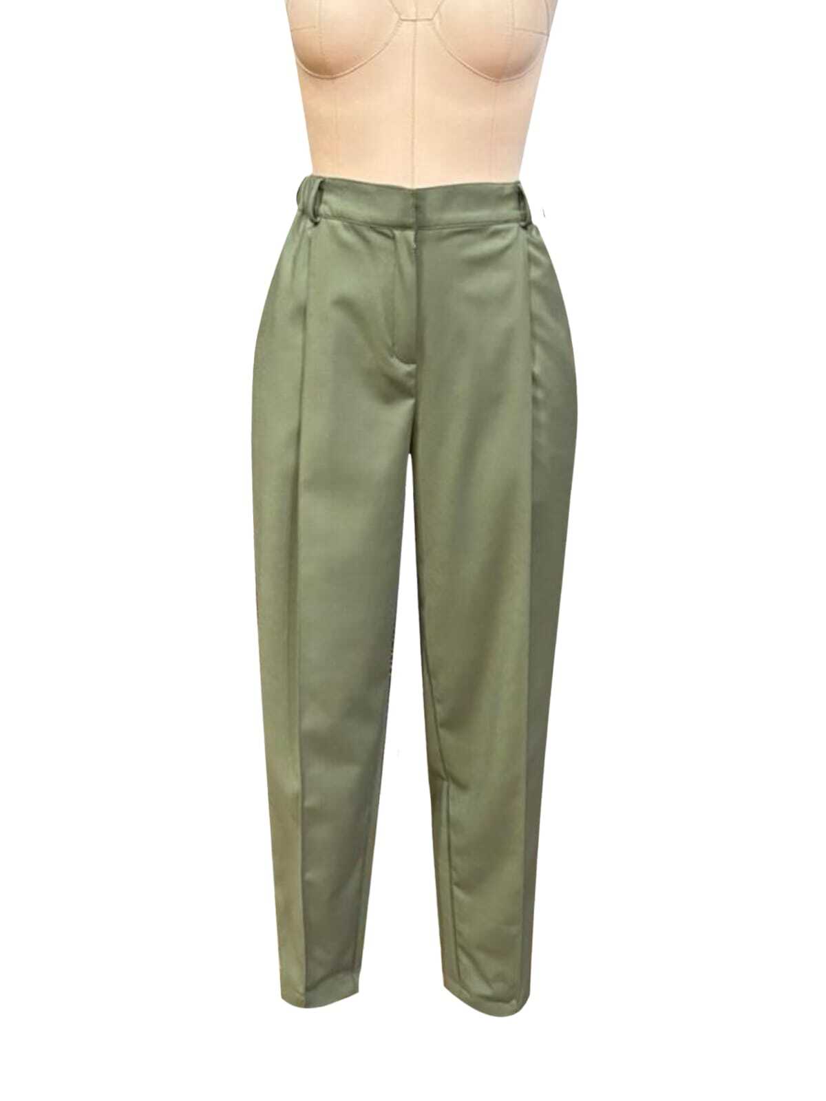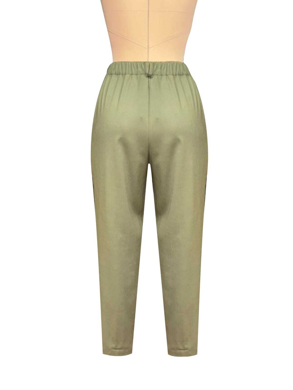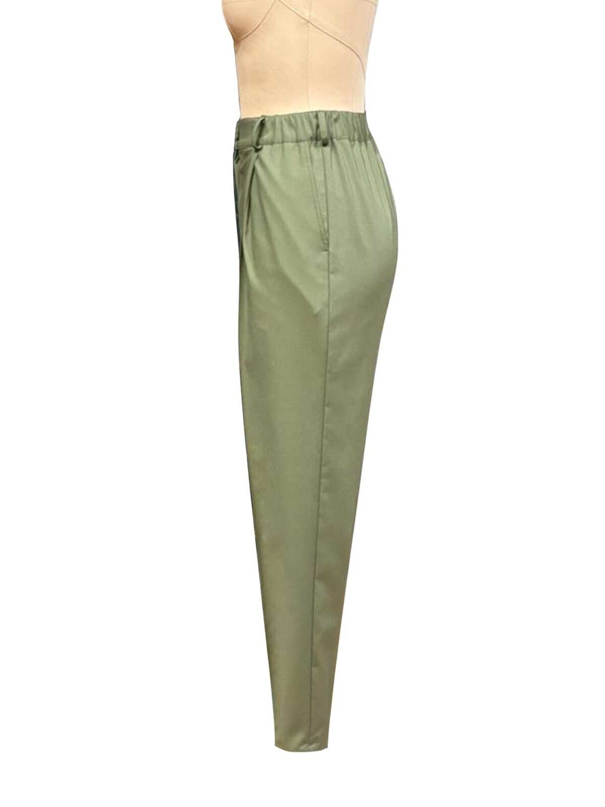 Брюки из вискозы в цвете хаки. На передней половинке брюк заложена и отстрочена складка. Брюки комфортные на  эластичном поясе со шлевками и удобными карманами. Застежка гульфик на молнии и крючке с пуговицей.