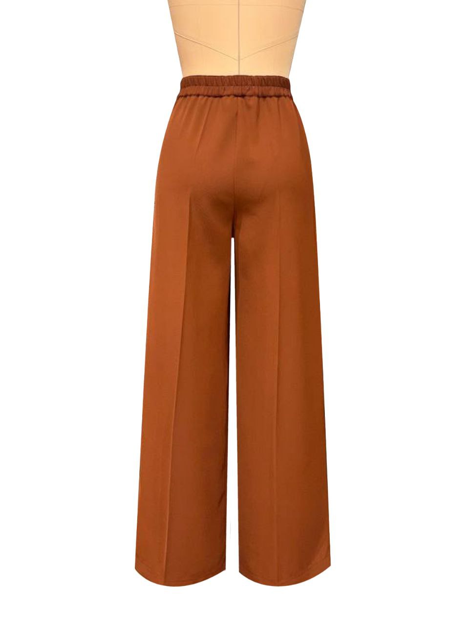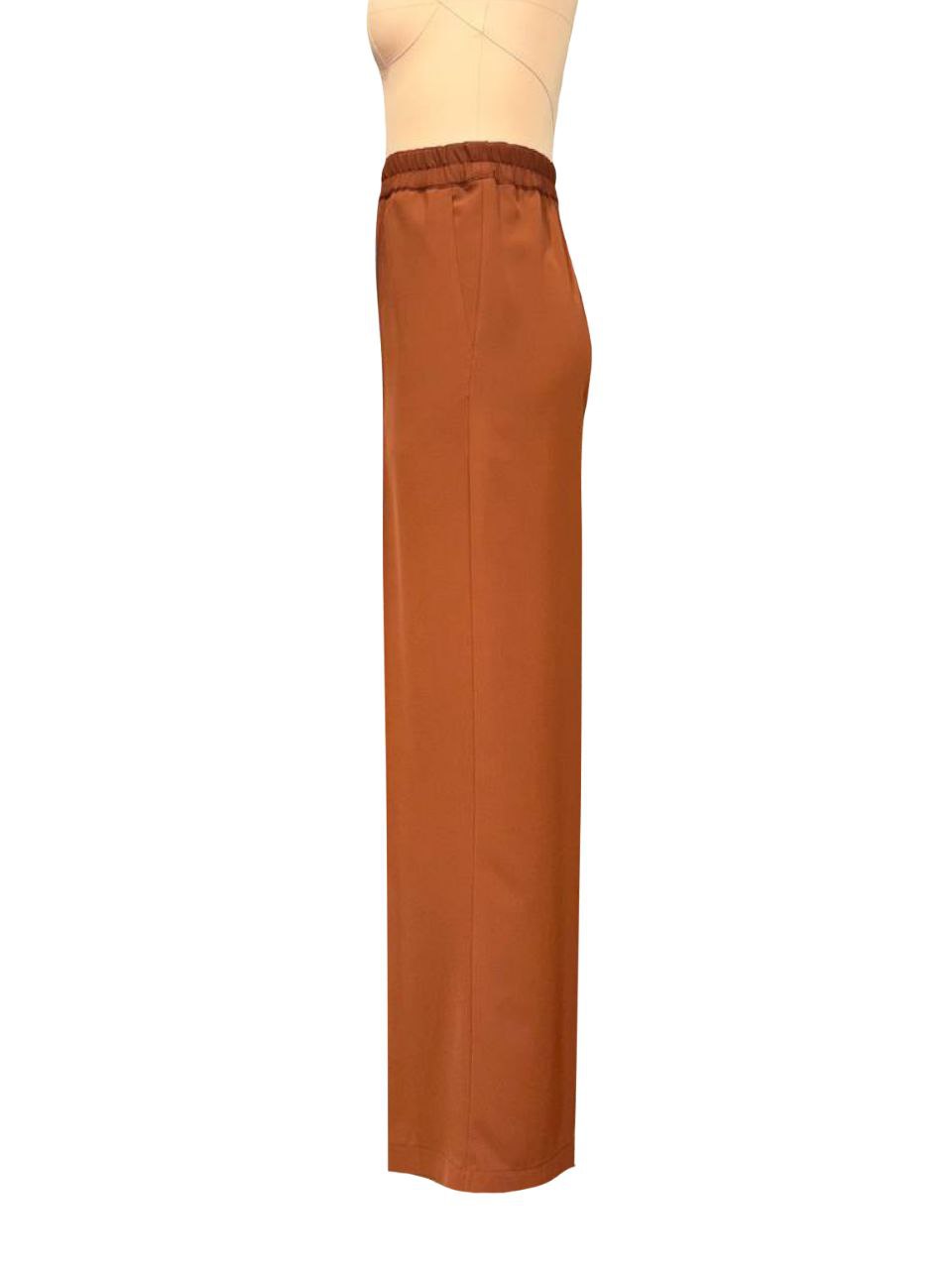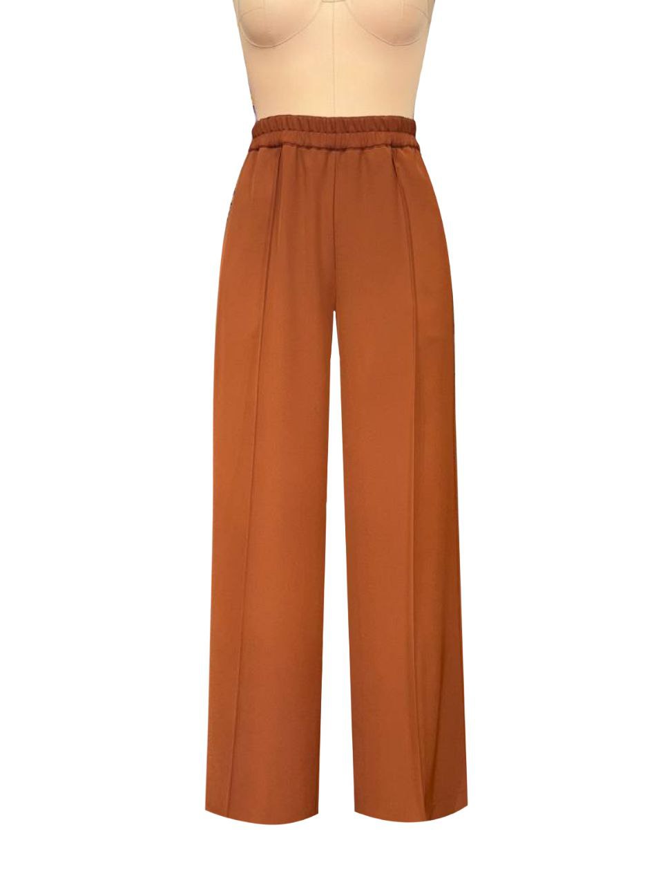 Брюки палаццо на эластичном поясе. По передним половинкам брюк прострочены стрелки. Для удобства добавлены карманы в боковом шве с отрезным бочком.