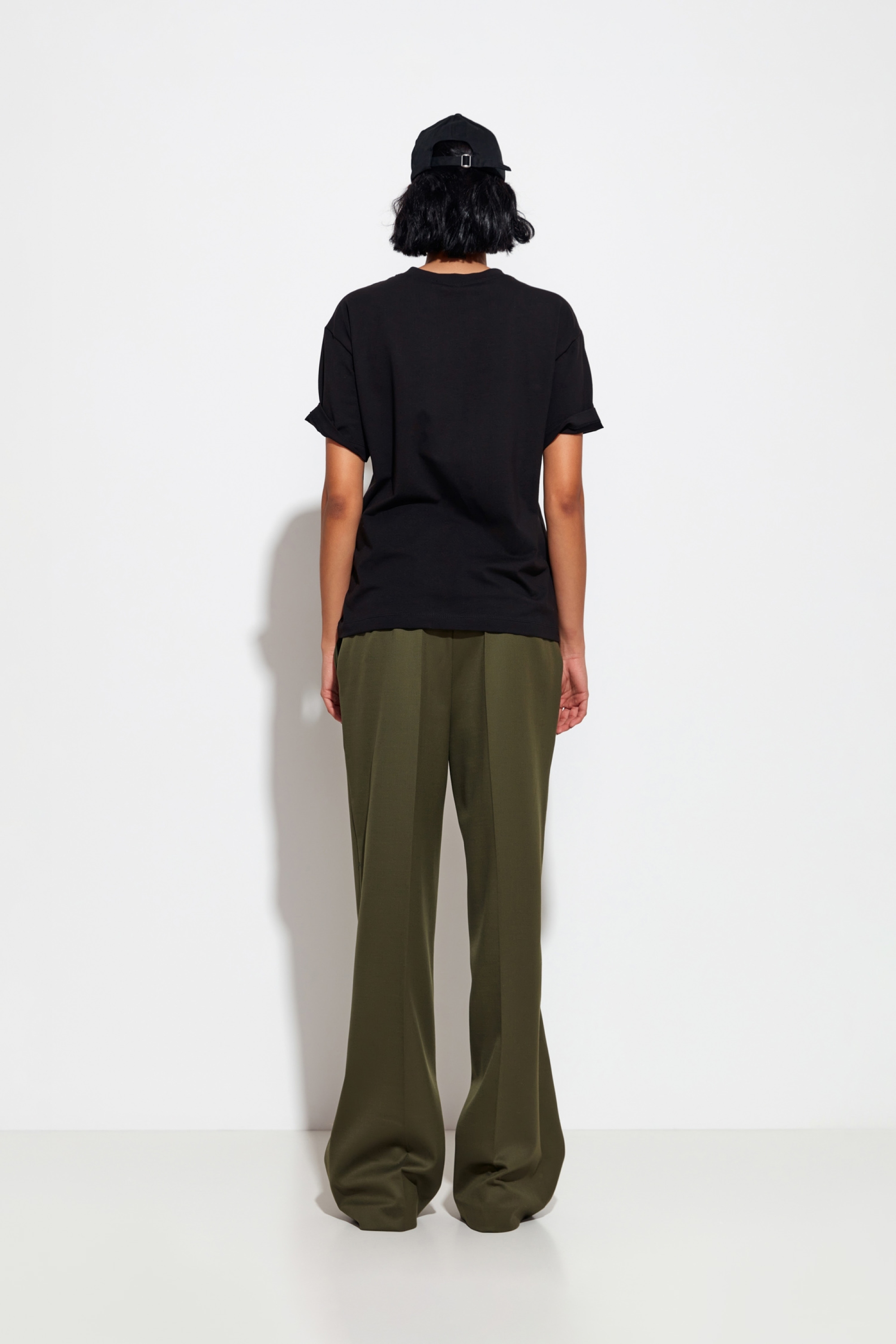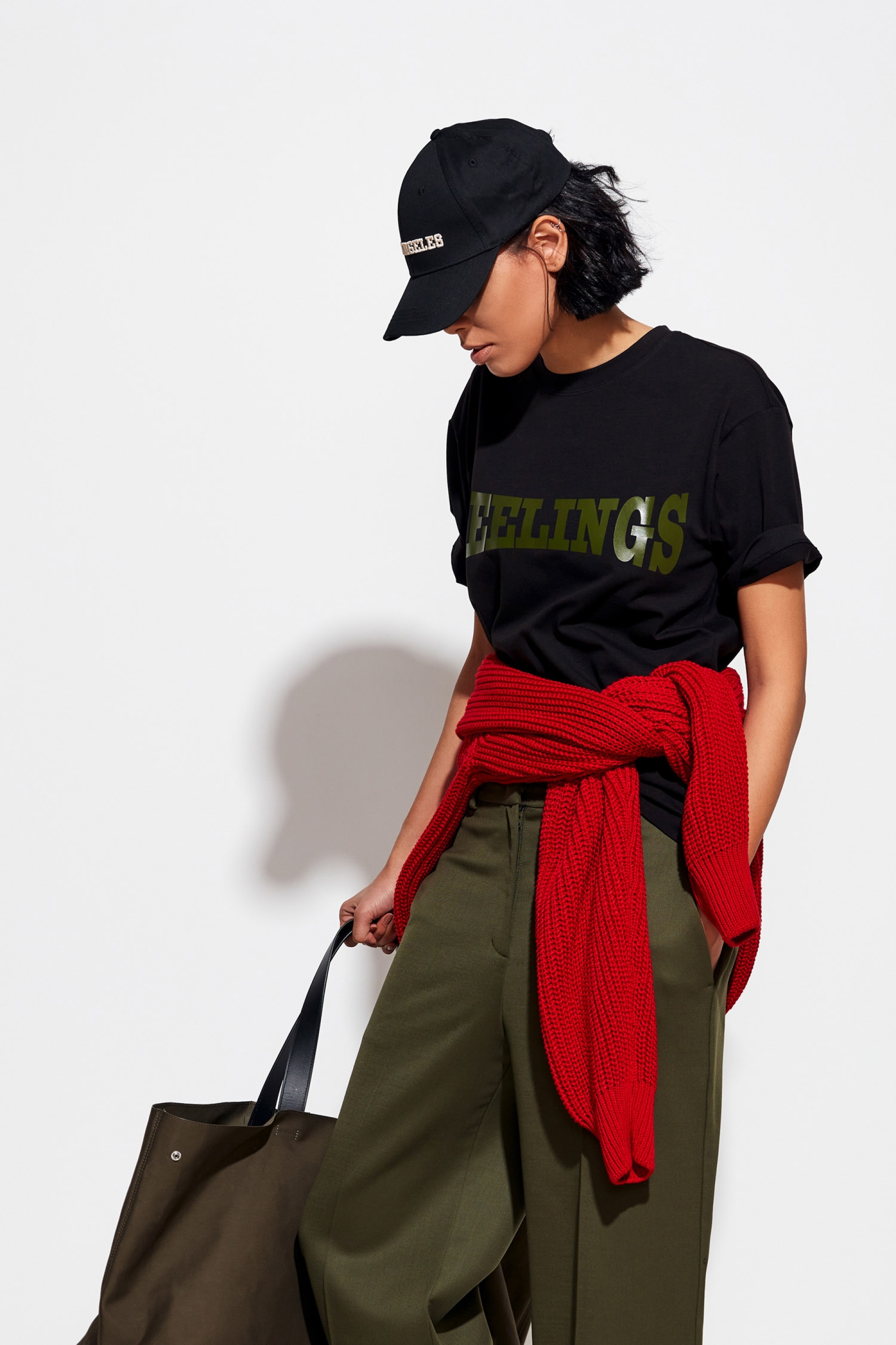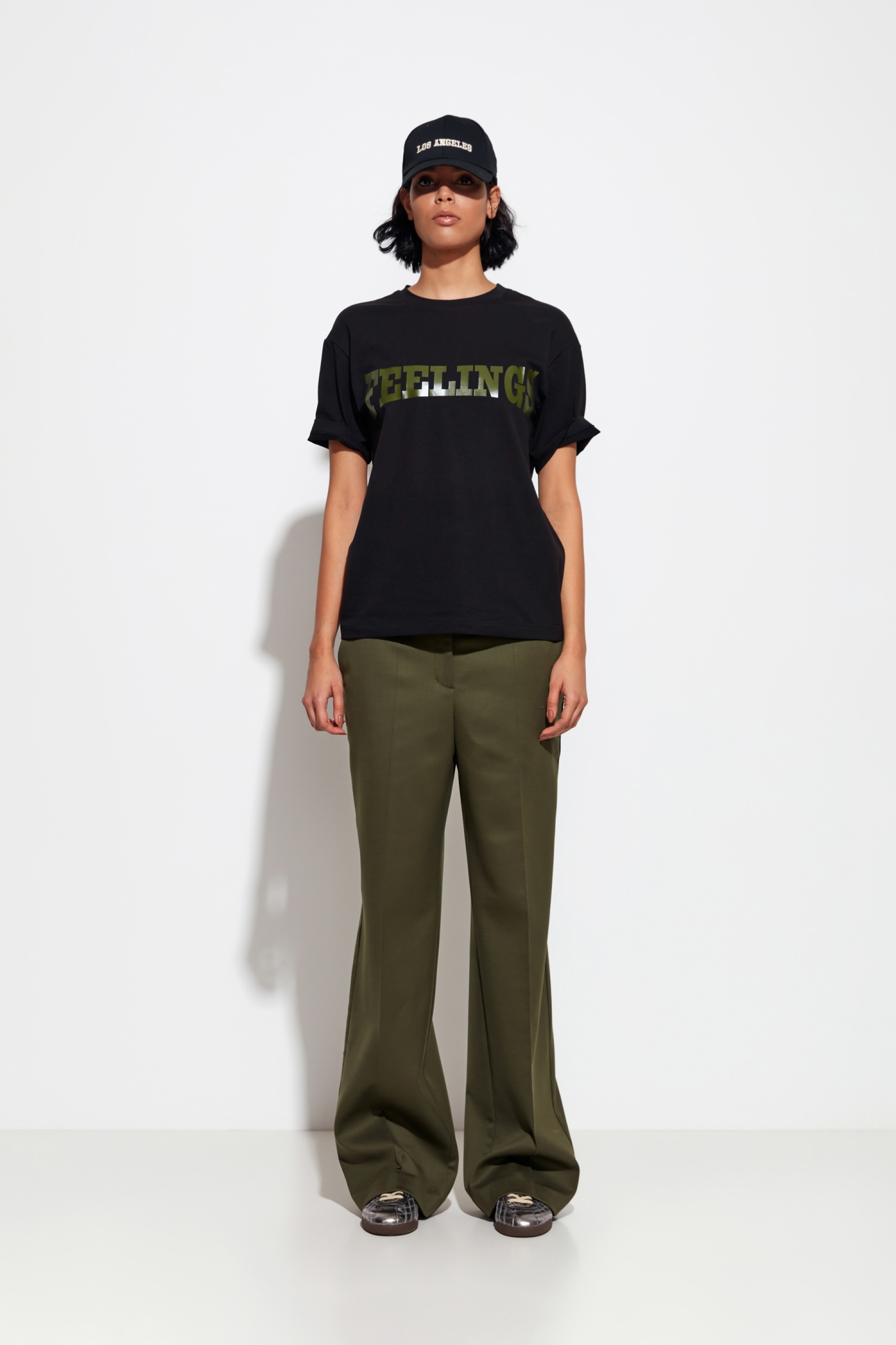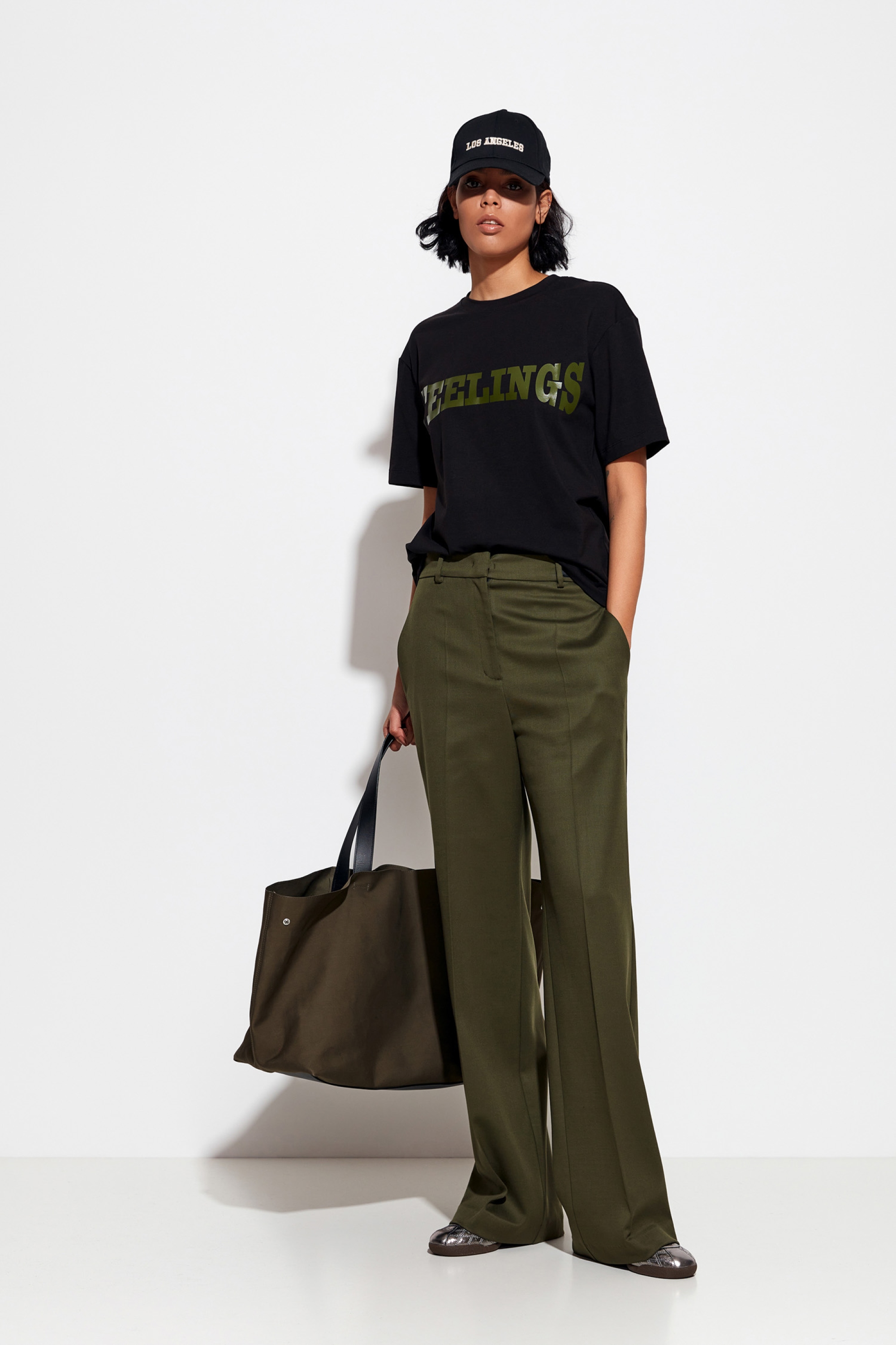 Футболка Lakbi универсалена и подходит для различных образов. Её можно носить с брюками, юбками, джинсами или шортами. Обувь можно выбрать как из категории деловой — туфли и лоферы, так и из более свободного стиля — ботинки или челси.