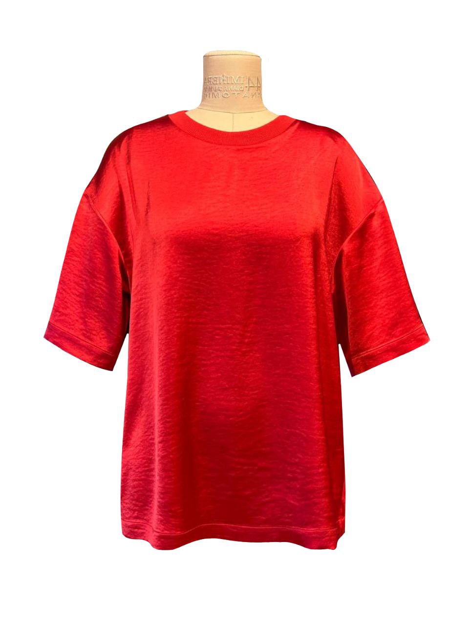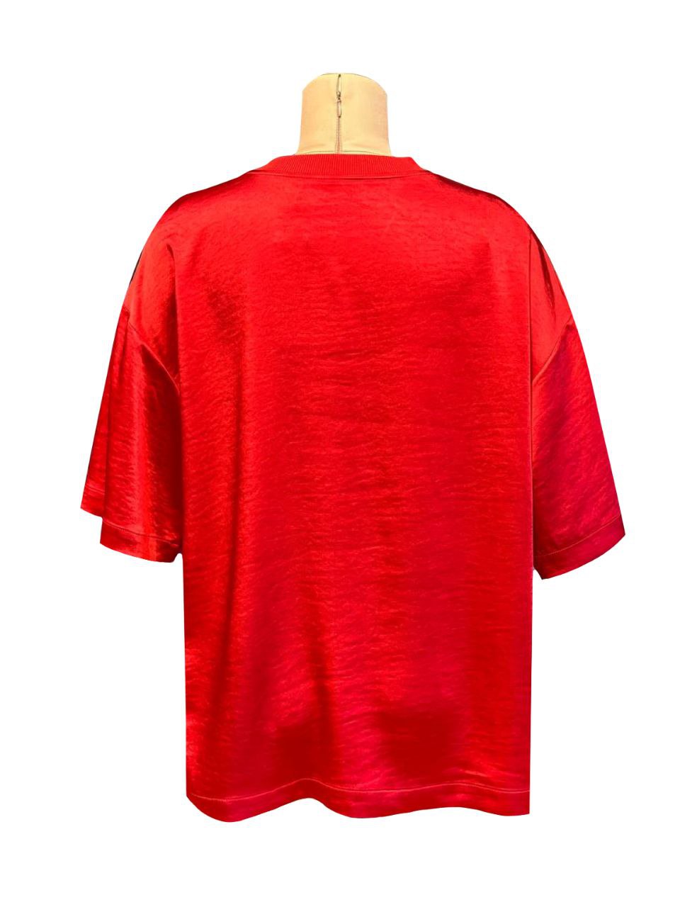 Базовая футболка овер с коротким рукавом из плотного сатина в насыщенном красном цвете. Горловина обработана кашкорсе.