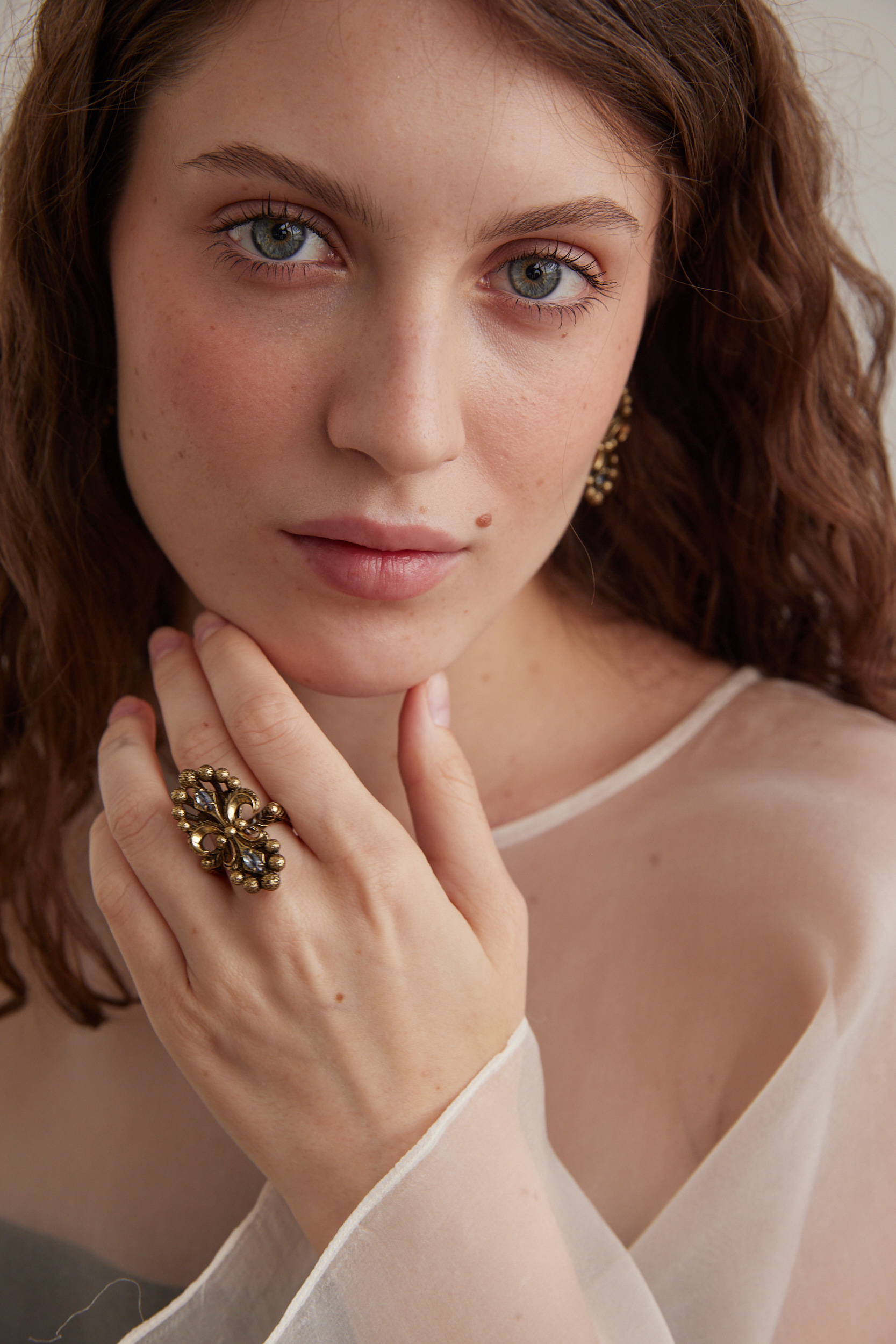 Кольцо ручной работы IRIS ARALDICO NOVA. Геральдический, прошедший сквозь века, ставший королевским символом и застывший на гербе Флоренции -  цветок ириса. Кольцо инкрустировано фианитами. Итальянский дизайн.