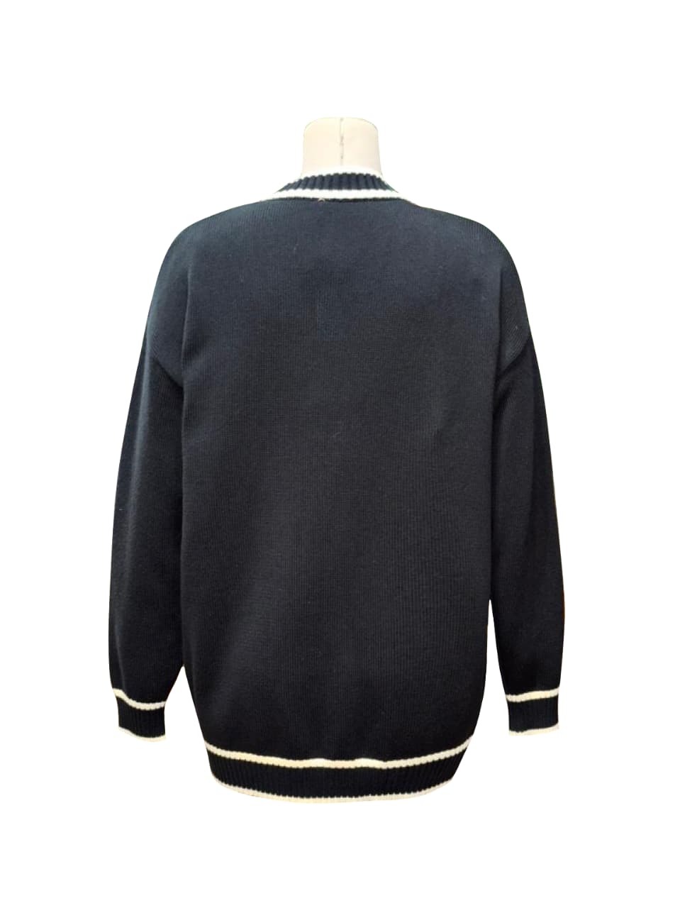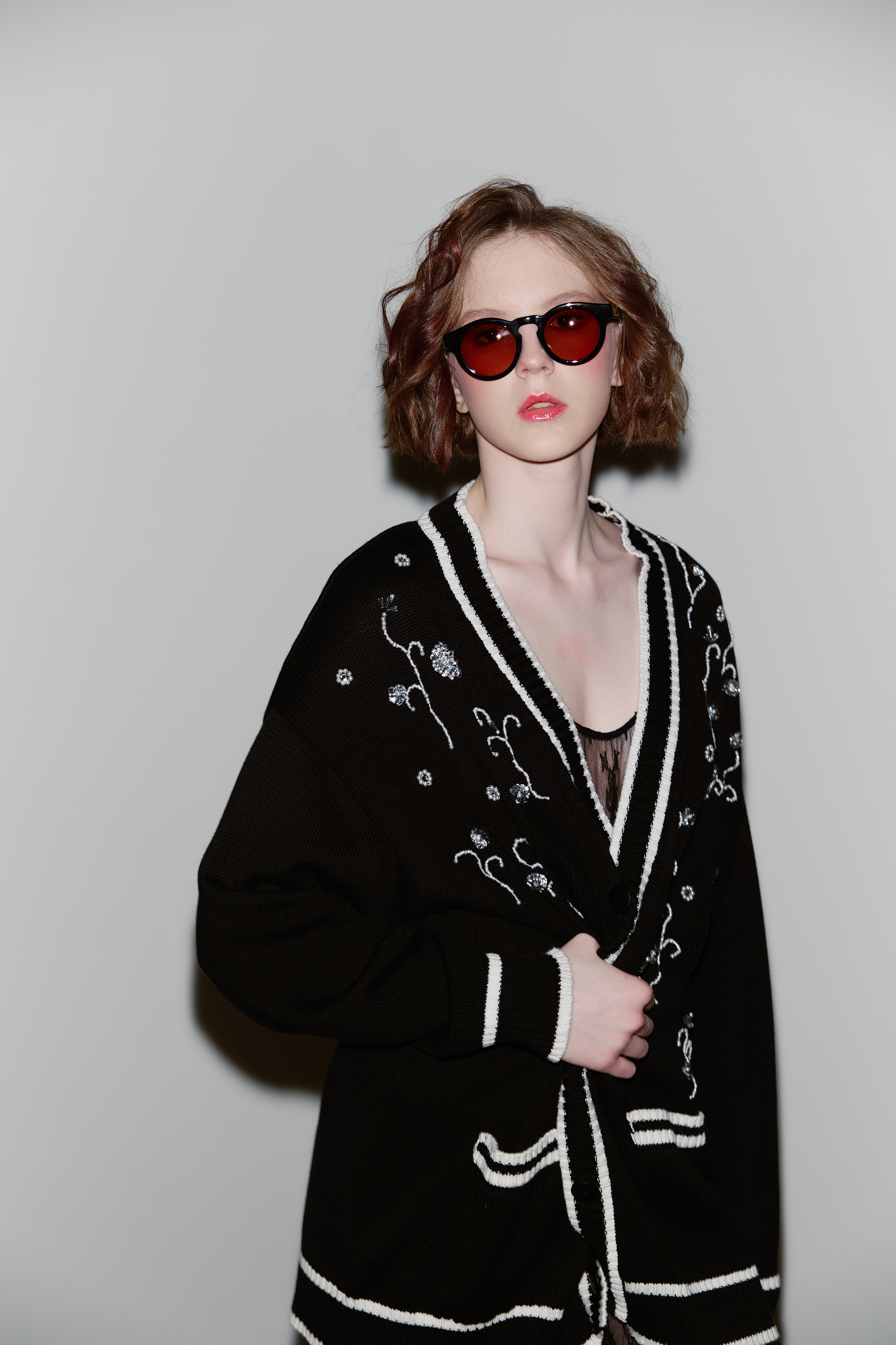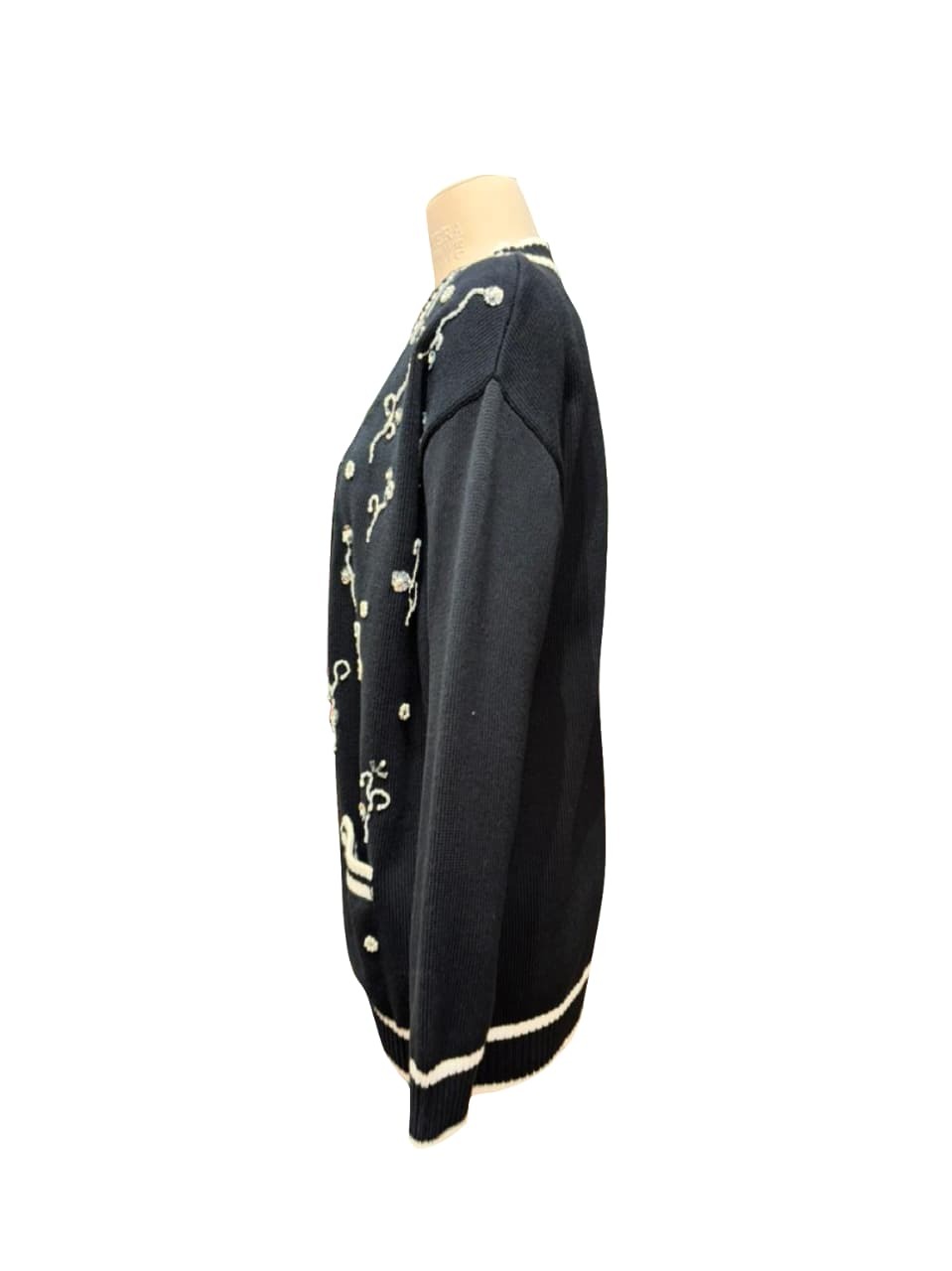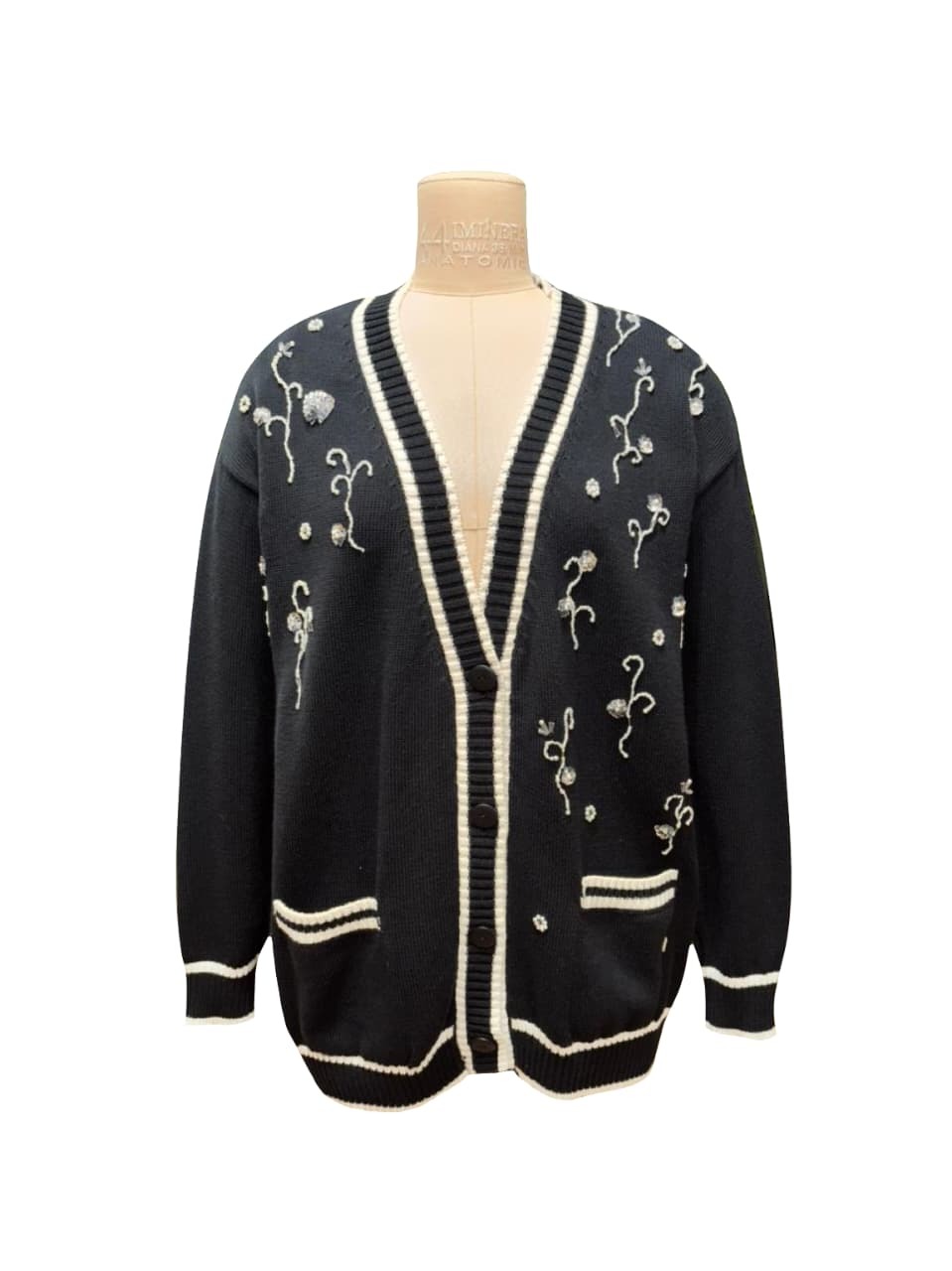 Вязанный хлопковый кардиган вручную декорирован пайетками, бусинами и бисером. Силуэт прямой, рукав спущен. Вырез V-образный. За счет контраста расставлены акценты по краям изделия. Застежка планка на черных матовых пуговицах. .Для удобства добавлены карманы