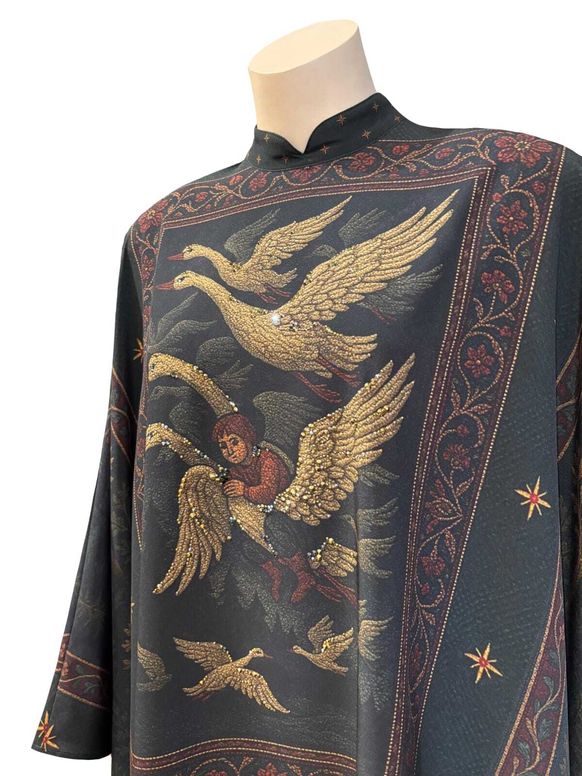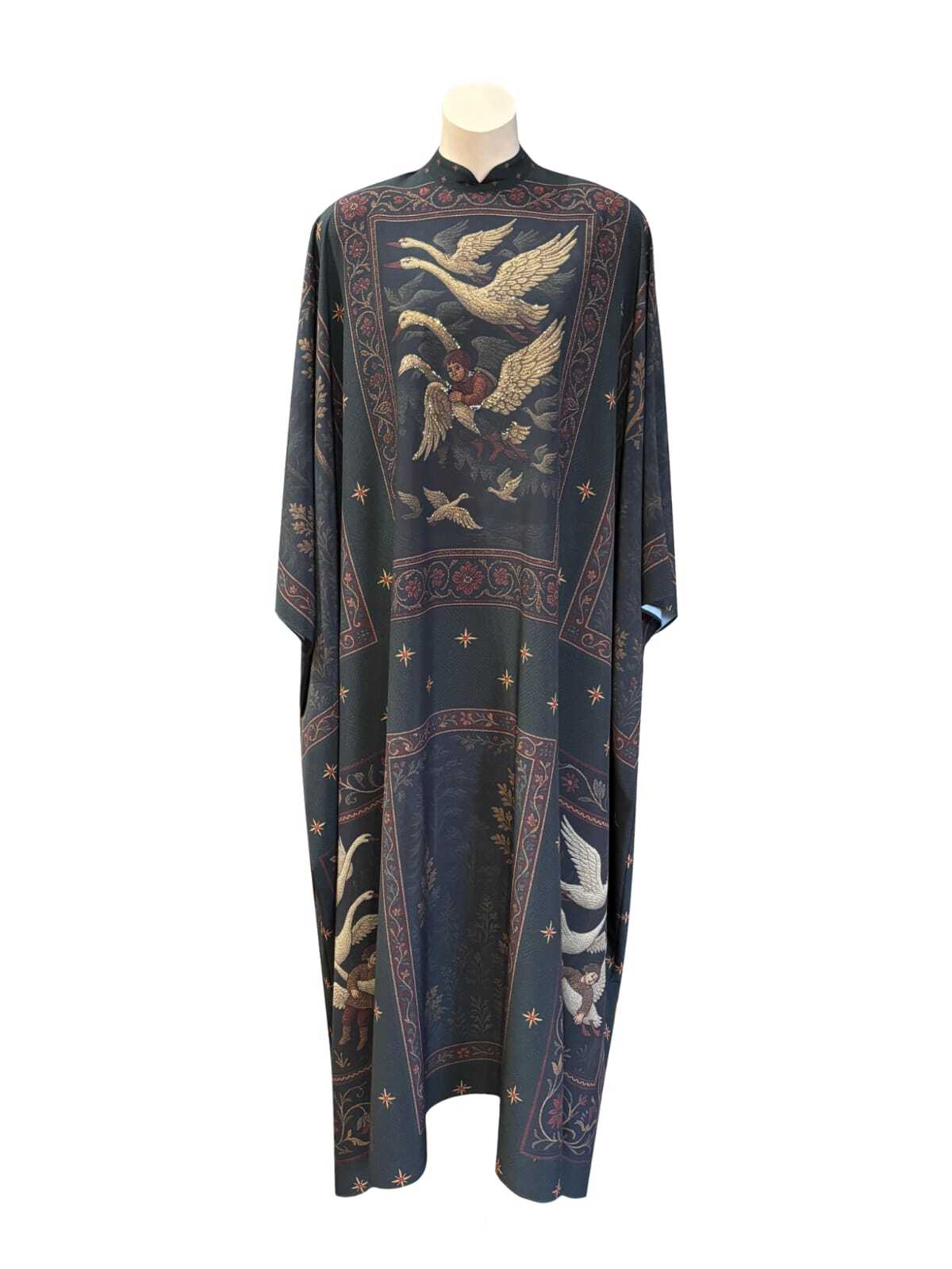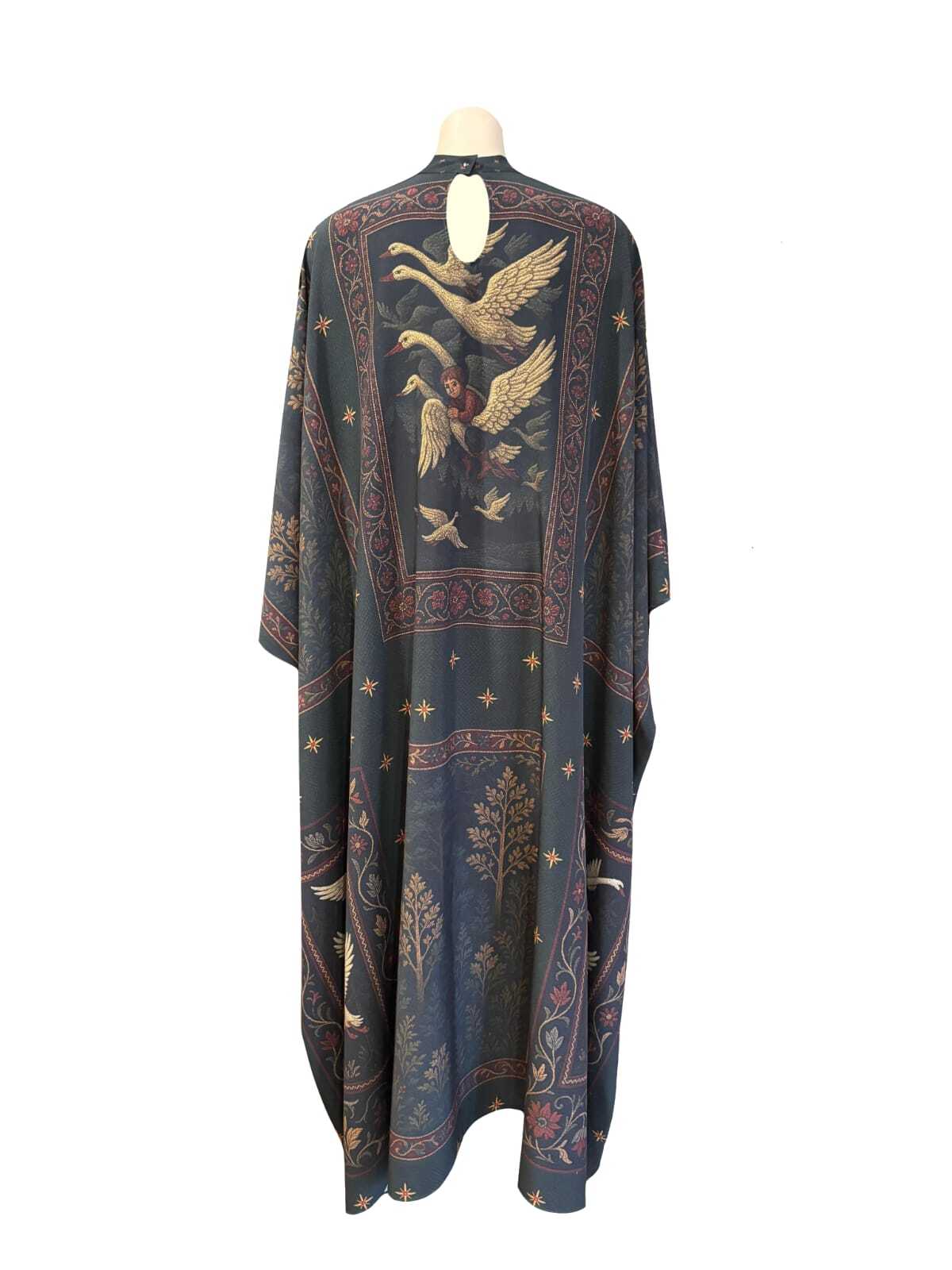 Платье с уникальным принтом имитирующим гобелен по мотивами сказки "Гуси-лебеди". Платье цельнокроенное по переду и спинке на подплечниках. В  боковых швах прорези для рук. Воротник стойка с фигурным вырезом и застежкой сзади на пуговицу.