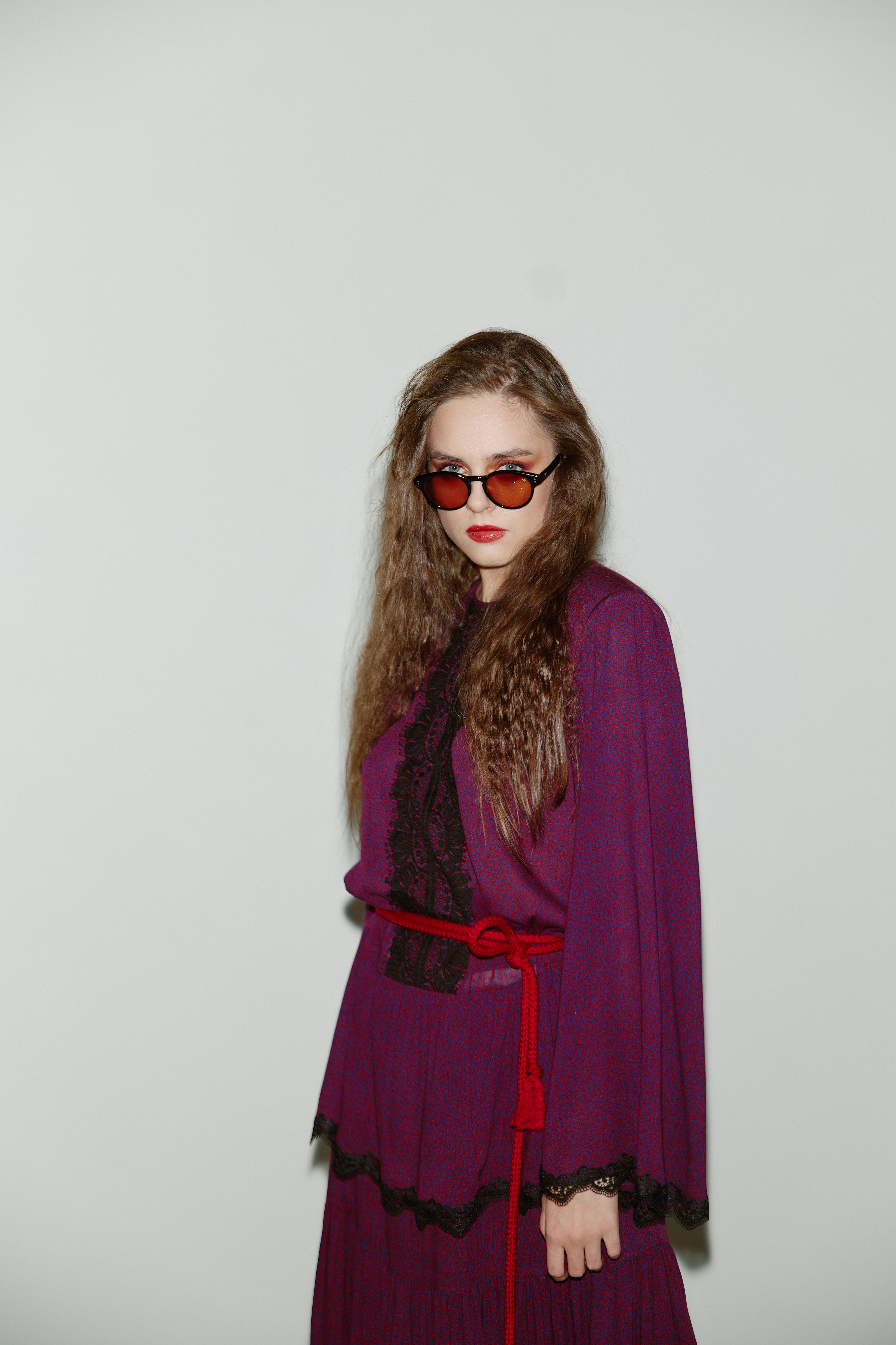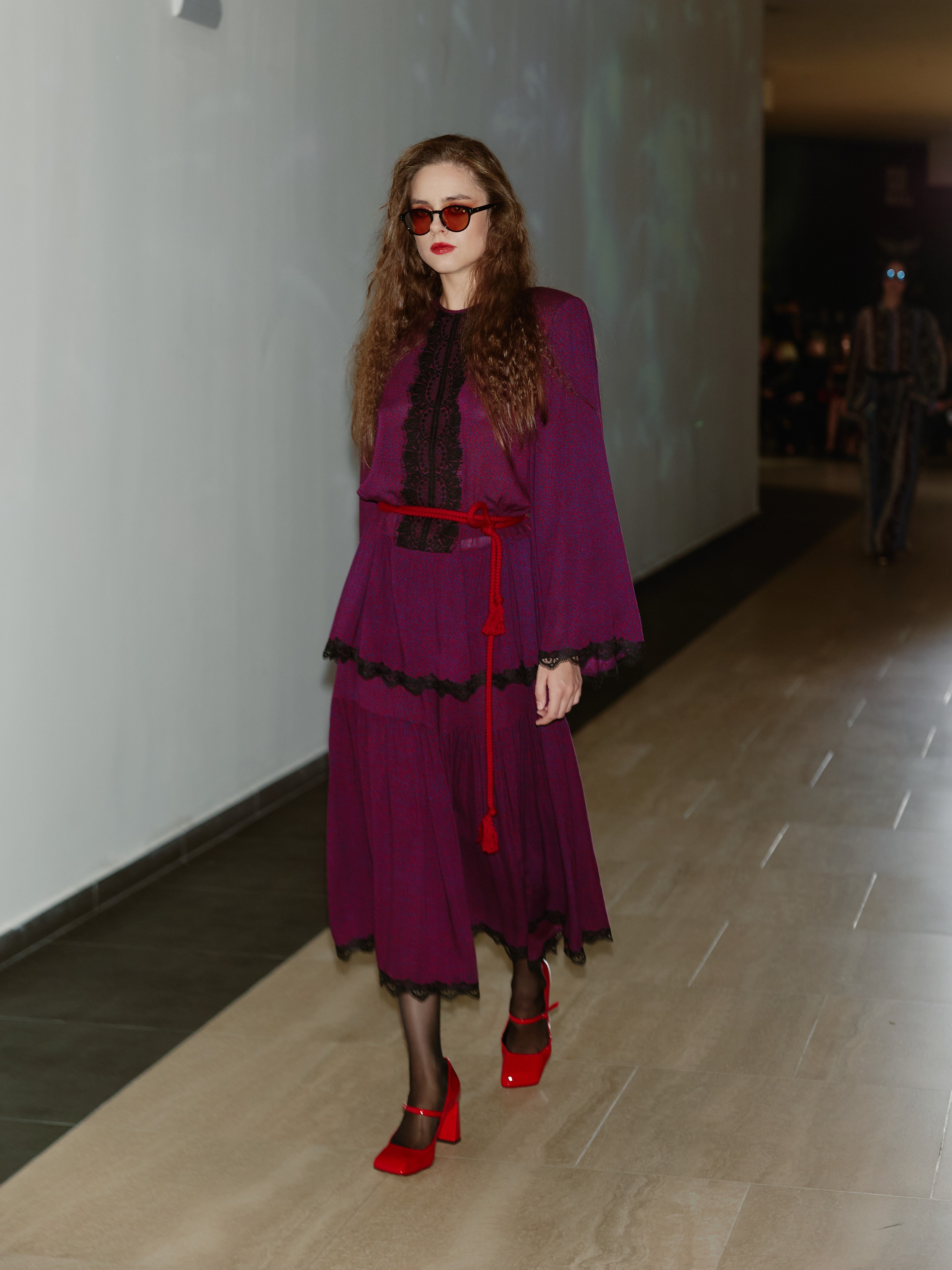 Платье тёмно-фиолетового цвета в мелкий красный цветочек выполнено из вискозы. Платье прямого силуэта с воланами. У платья круглый вырез горловины и застежка на потайную тесьму-молнию на спинке. Рукава длинные с расширением к низу. По середине переда настрочено широкое кружево, низ воланов и рукавов декорирован кружевной тесьмой.