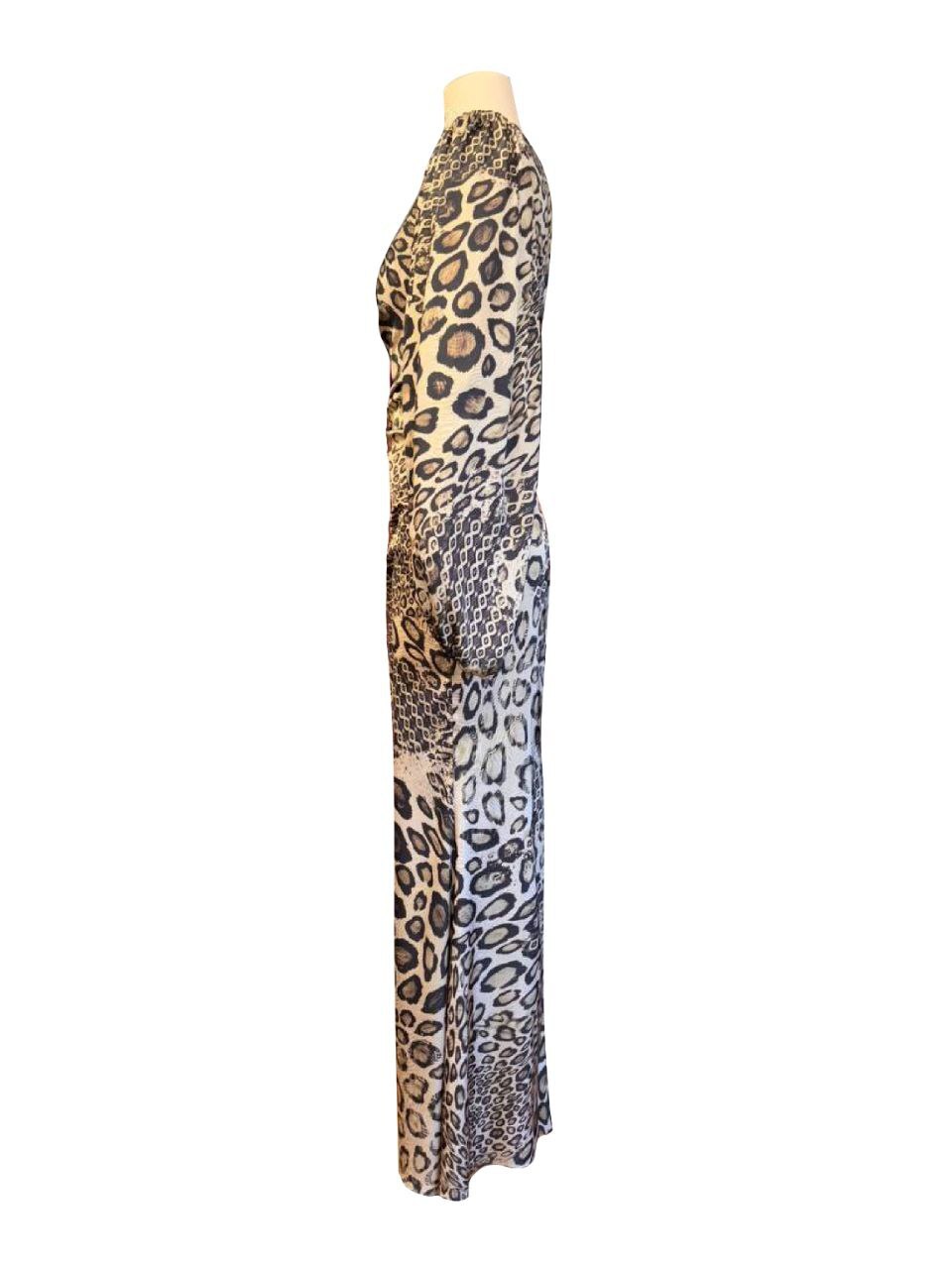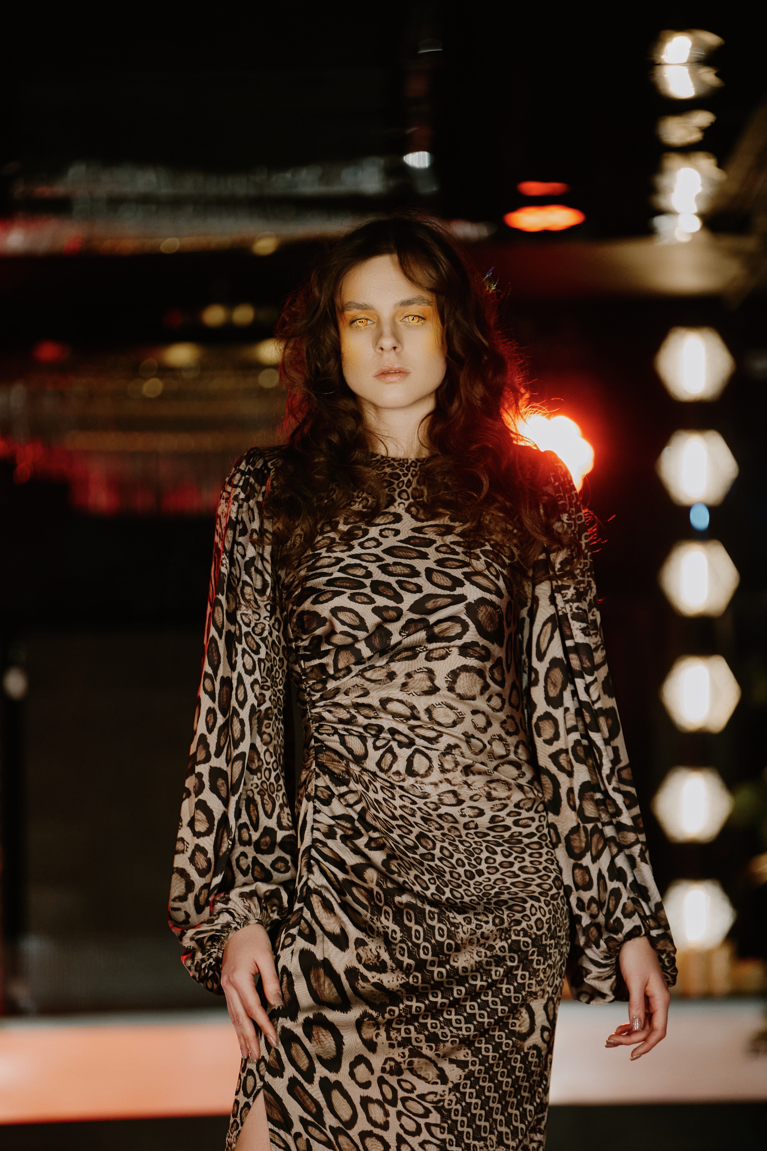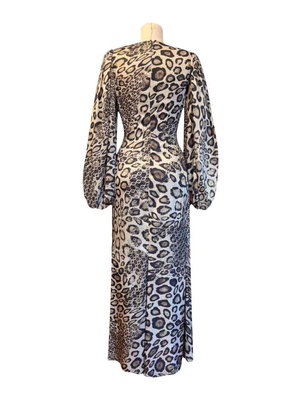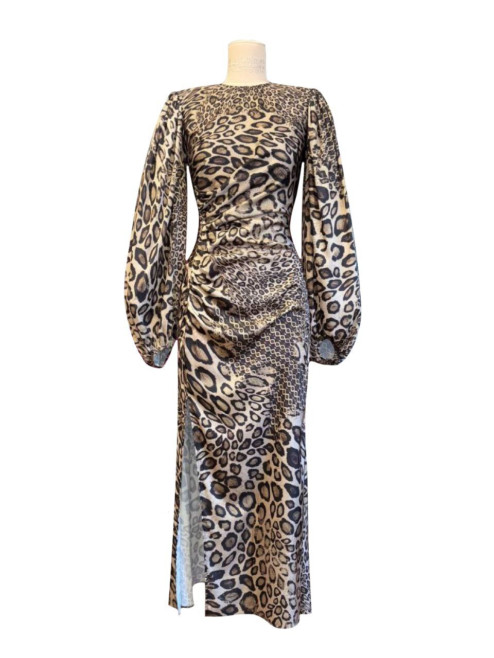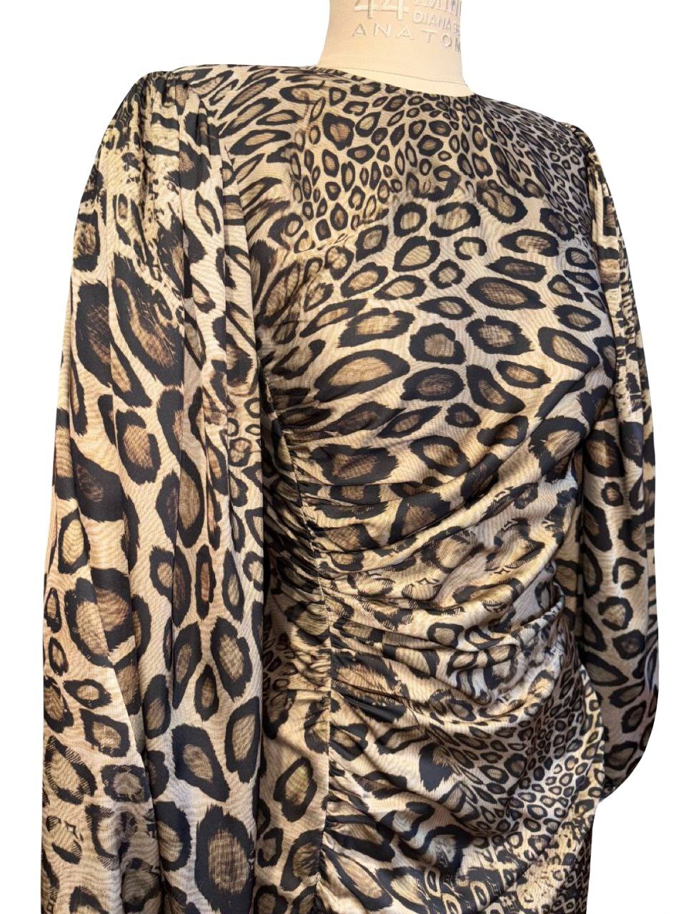 Шелковое вечернее платье с леопардовым принтом. Платье приталенного силуэта  с драпировкой по переду и высоким разрезом. В среднем шве спинки застежка на потайную тесьму молнию. Пышный рукав фонарик со сборками по окату и низу.