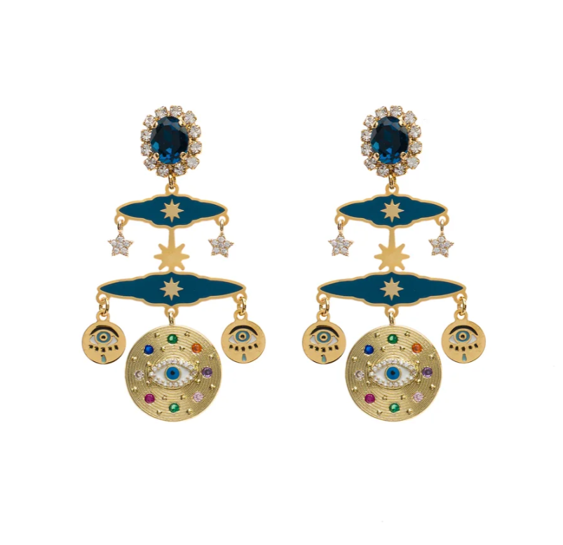 Наилегчайшие яркие серьги "Цыганские глаза" изготовлены из гипоаллергенной позолоченной латуни, покрыты тонированной эмалью, украшены подвесками и инкрустированы кристаллами.