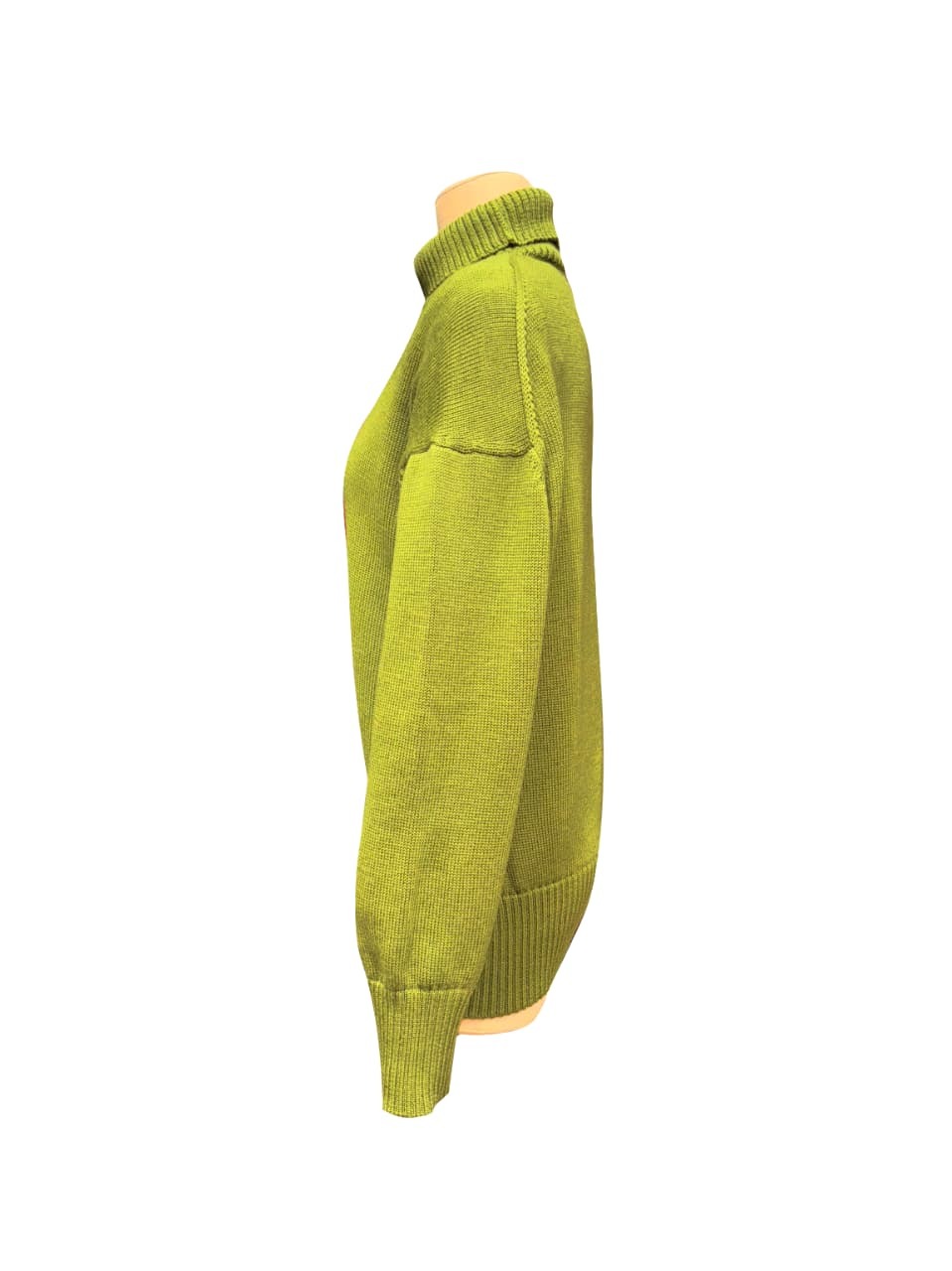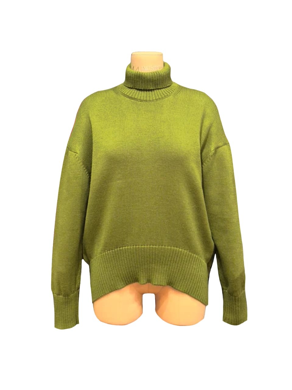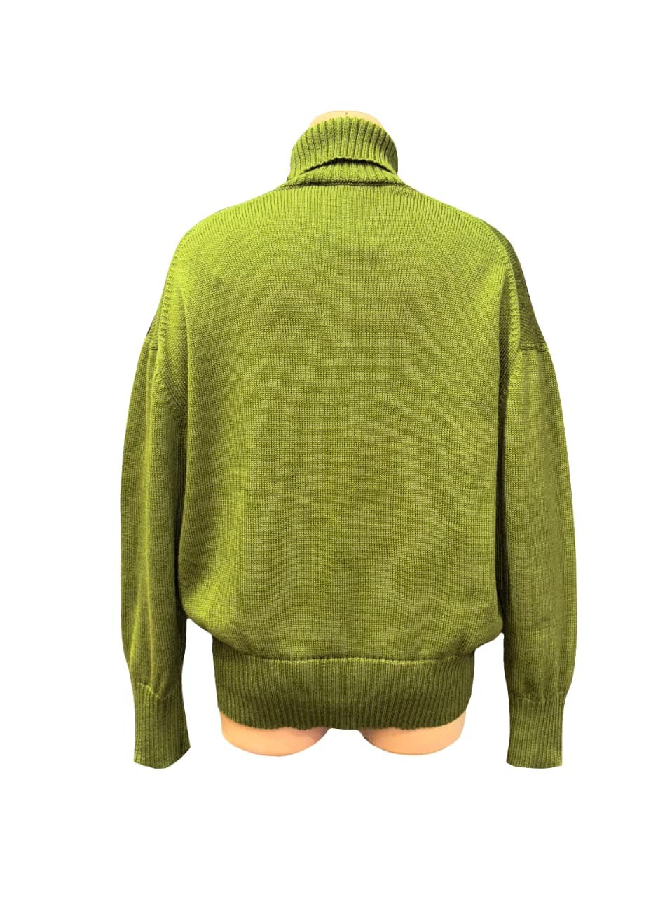 Вязанный шерстяной свитер в насыщенном зеленом цвете. Силуэт прямой с небольшим заужением к низу, рукав спущен. Высокий воротник мягко облегает шею. Низ свитера с удлинением на спинке.